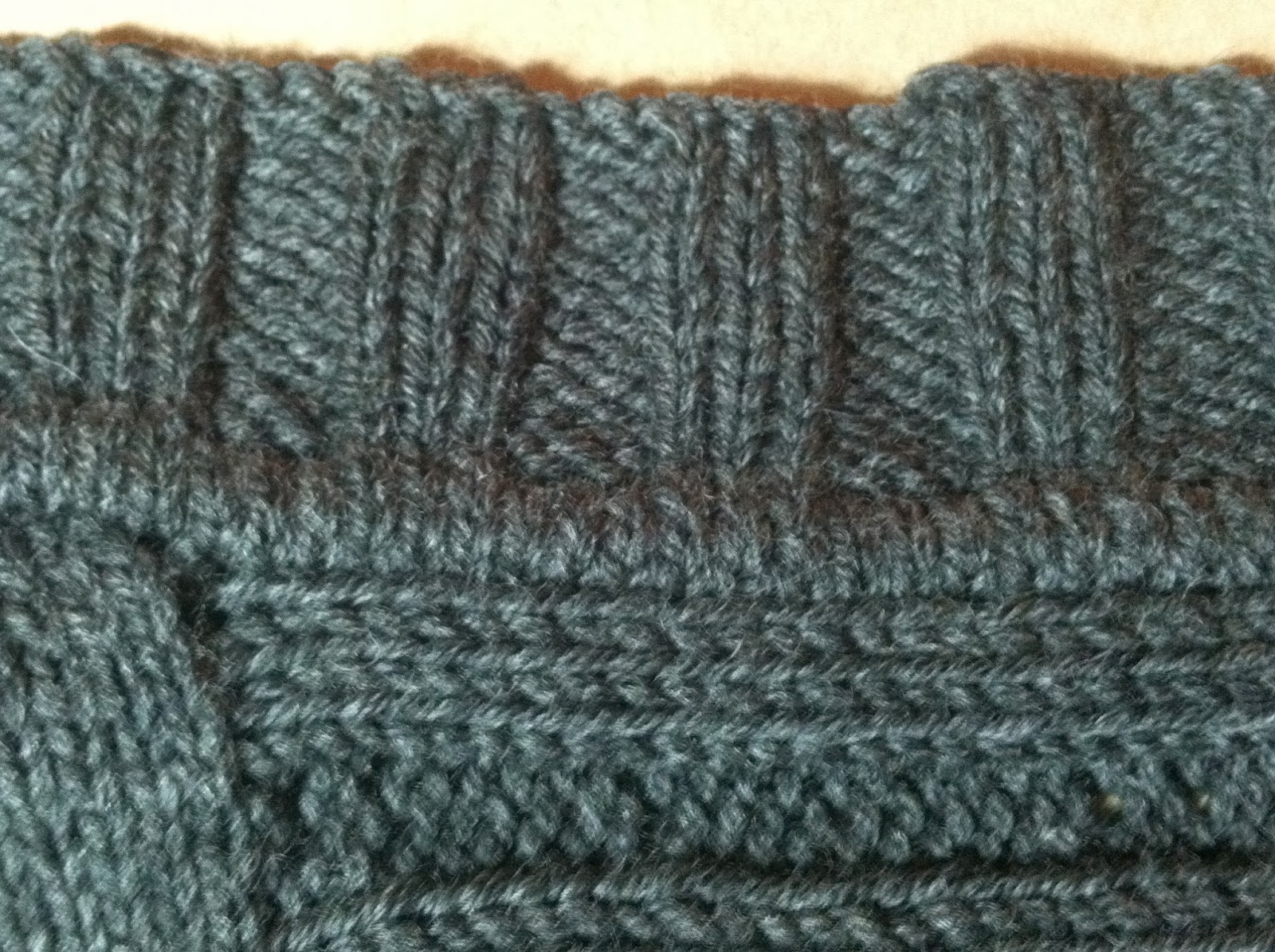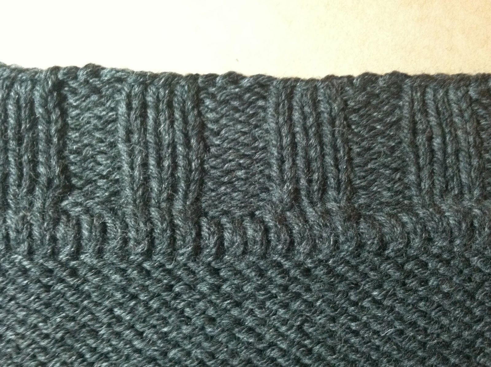 8. Then I continued working the button band in the ribbing pattern to its desired width. The "seam" is covered by stockinette stitch fabric.