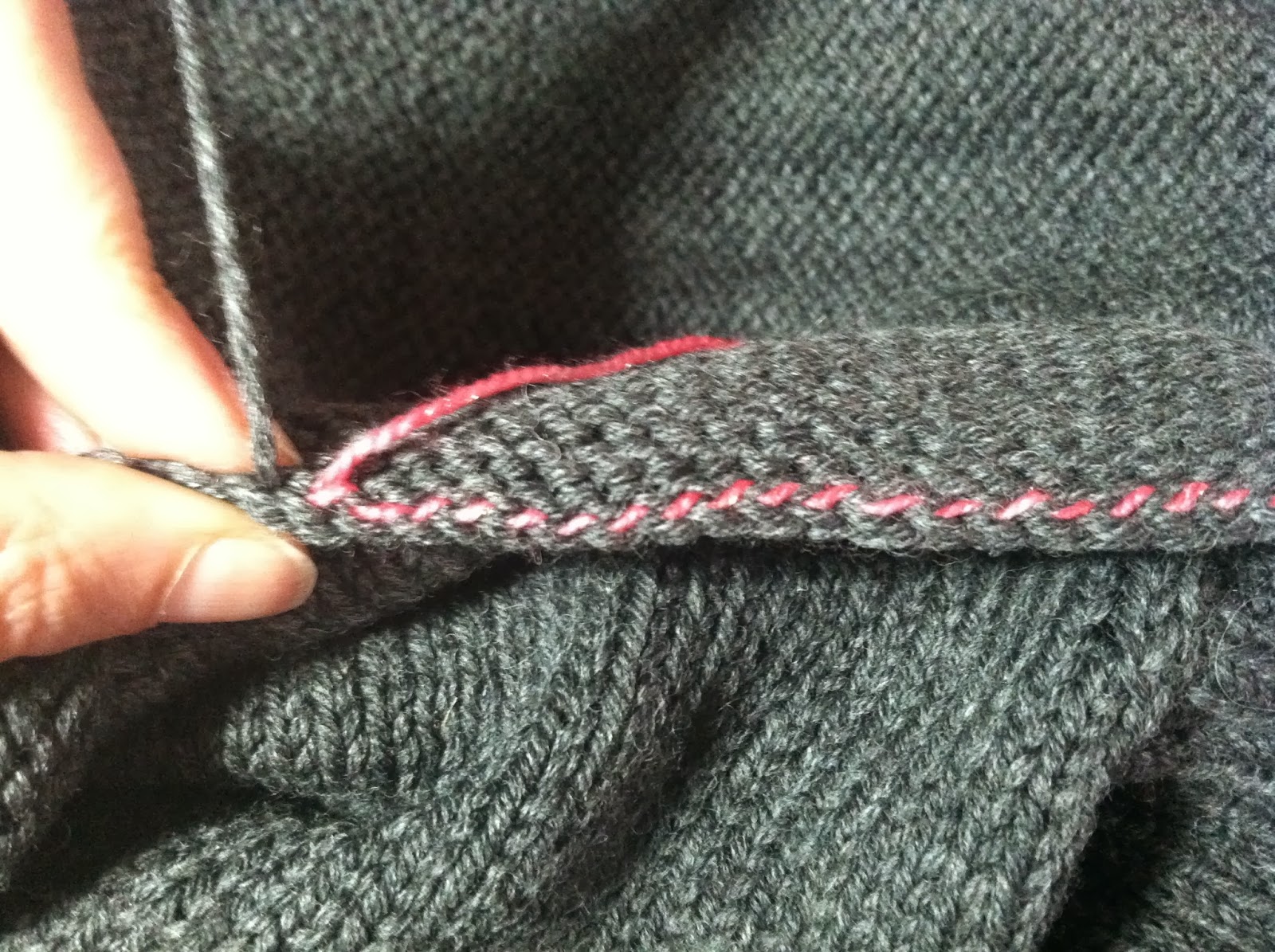 5. Once I had picked up all the loops from the wrong side of the fabric, I pulled out the pink yarn ("life line") and worked 2 rows of stockinette stitch, using a long circular needle that was one size smaller than the needle size of the button band needle and the yarn that I had used for the other side of the button band.